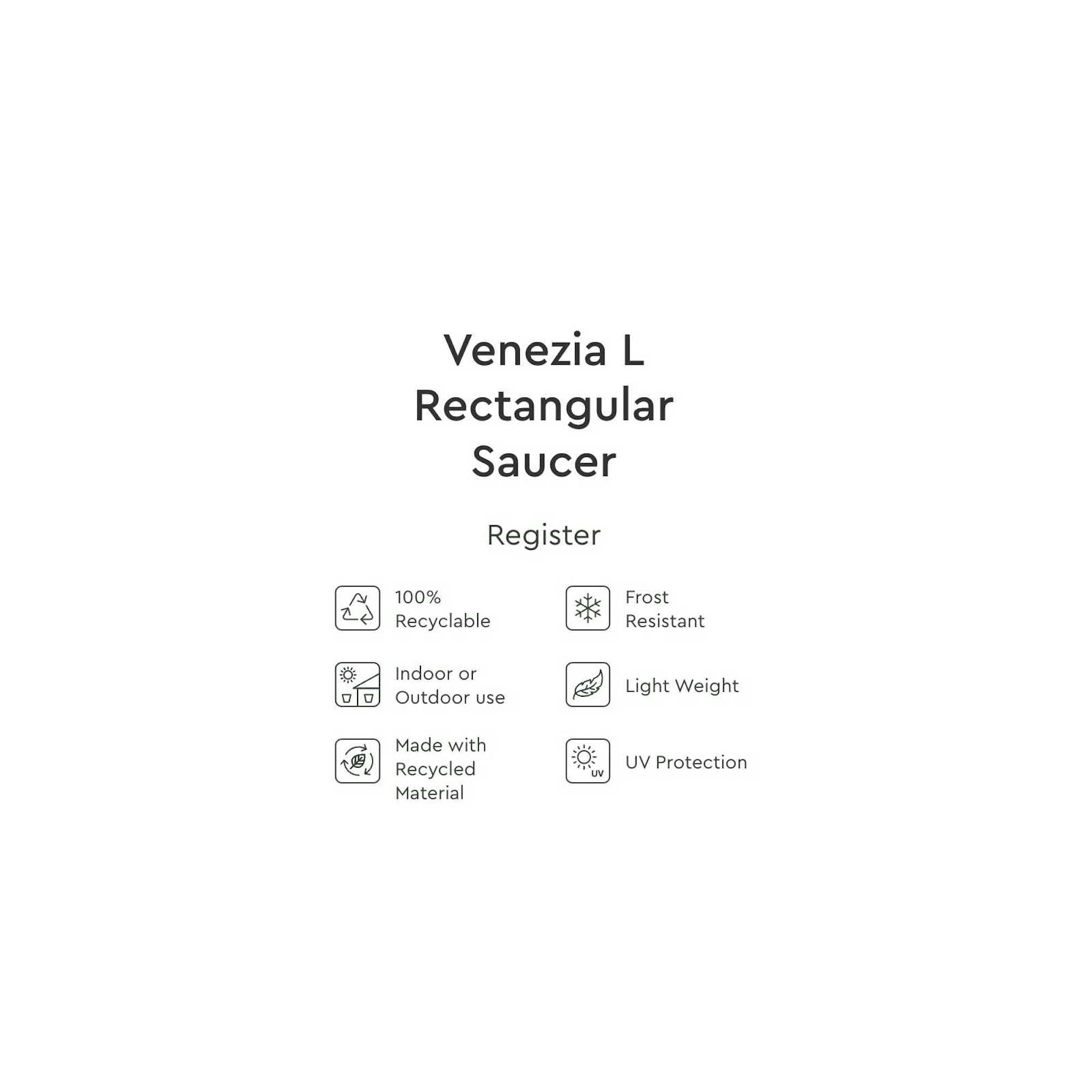 Farfurie rectangulara pentru jardiniera Venezia Large. Din plastic de foarte buna calitate, care se poate intretine usor cu o laveta umeda. Are rol de colectare a apei in exces provenite prin udare sau interperii. De asemenea, protejeaza suprafetele pe care sunt asezate jardinierele impotriva umiditatii.